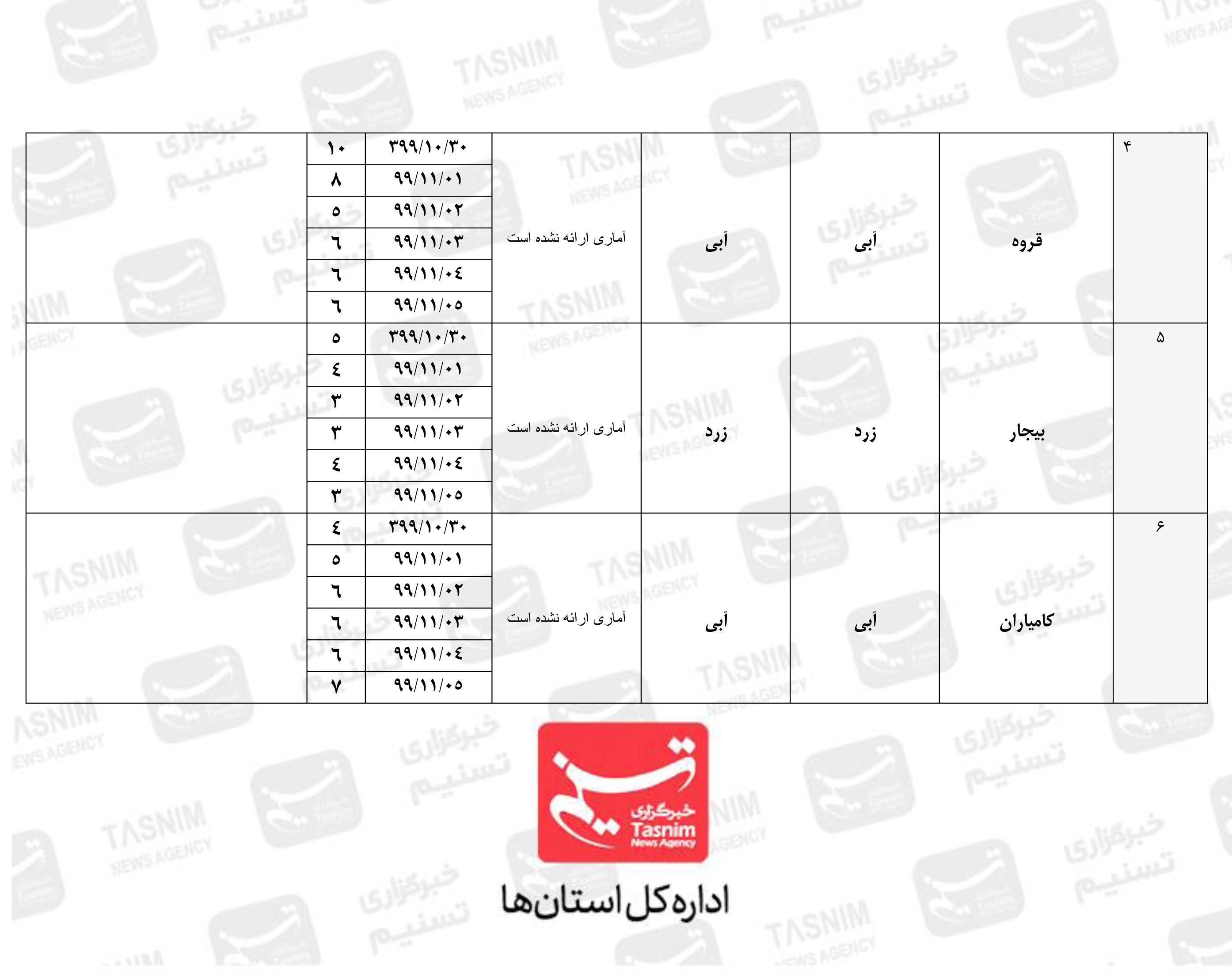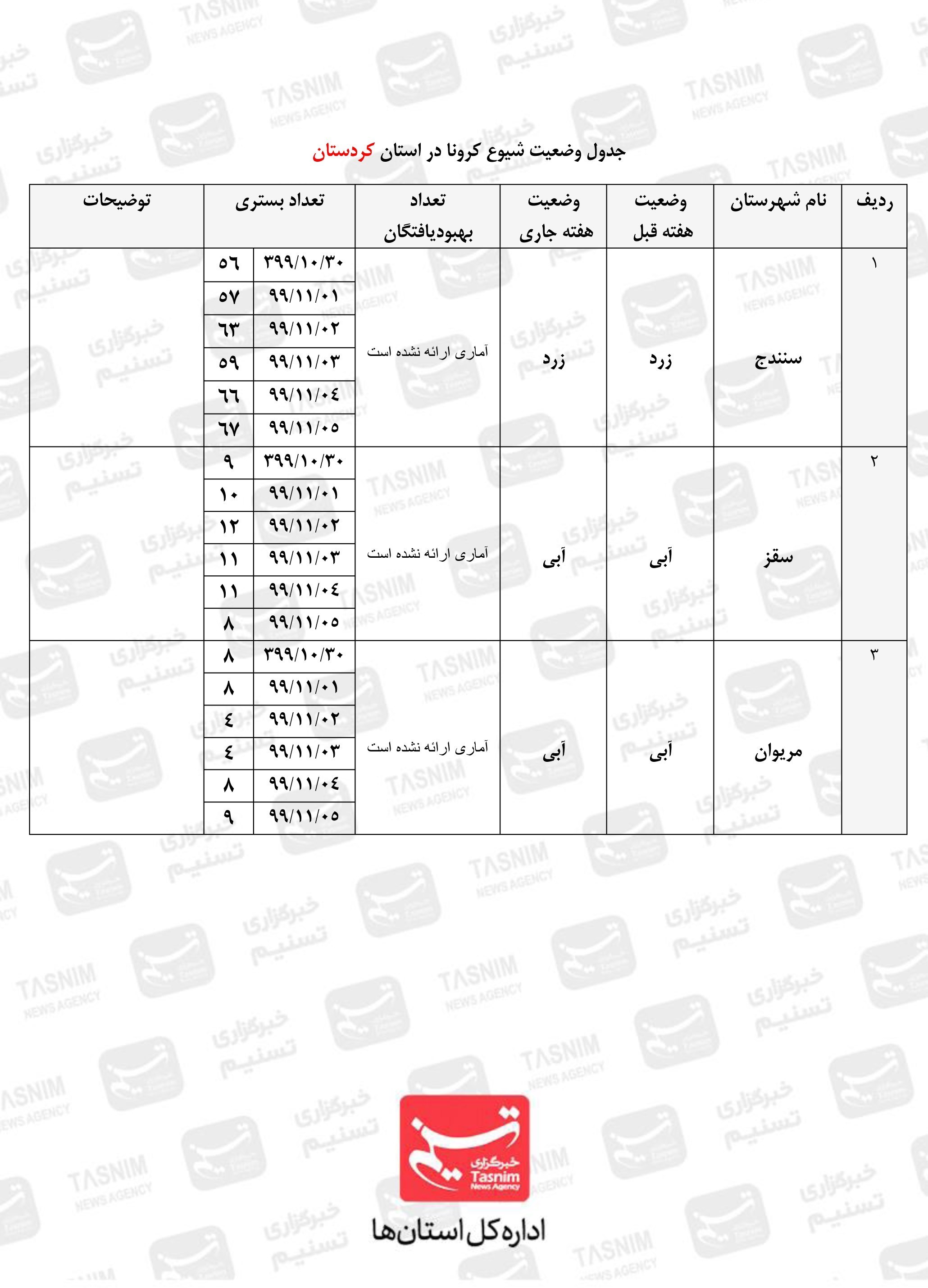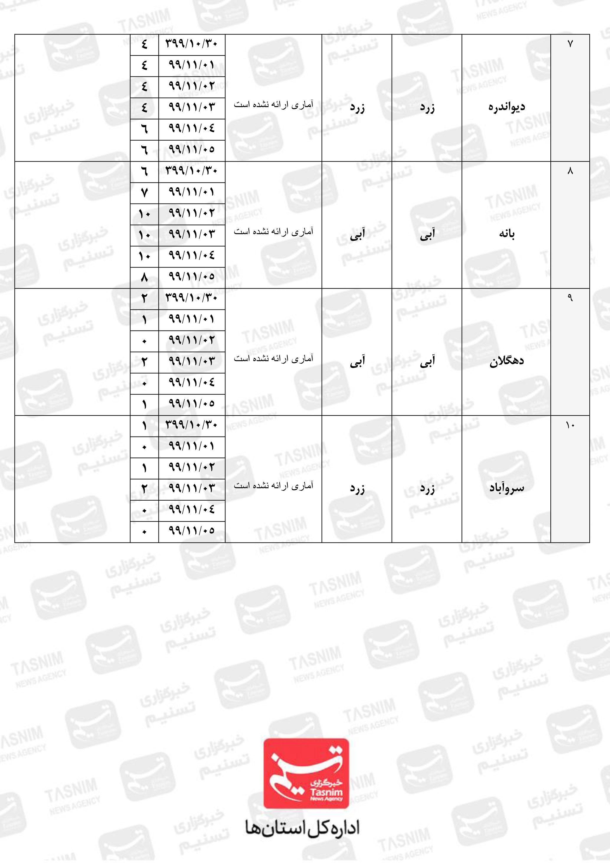 براساس اعلام علوم پزشکی استان کردستان شهرستان سقز، مریوان، قروه، کامیاران، بانه و دهگلان آبی رنگ بوده و شهرستان سنندج، بیجار، دیواندره و سروآباد زرد رنگ هستند.