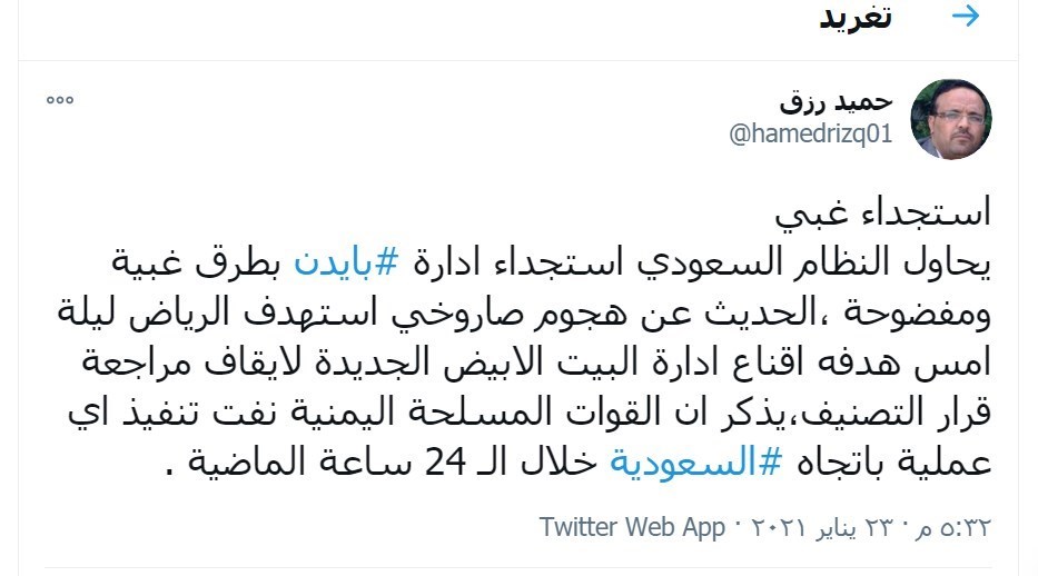 اکنون این احتمال وجود دارد که آمریکا در تحریم یمن بازنگری کند و انصارالله را از فهرست گروههای تروریستی خود خارج کند، در این صورت راه برای حلوفصل مسالمتآمیز جنگ یمن فراهم میشود، این راهحل مسالمتآمیز با خواسته عربستان سازوکاری ندارد، به همین دلیل، ریاض میخواهد با طرح ادعای واهی مانع ارائه کردن هرگونه راهحل مسالمتآمیز در جنگ یمن شود، امری که حمید رزق فعال رسانهای یمن و از چهرههای نزدیک به انصارالله نیز در توئیتی بدان اشاره کرد: نظام حاکم عربستان سعودى با حماقت و رسوایی در تلاش براى دست به دامان شدن دولت بایدن است و با صحبت از حمله موشکى به ریاض بهدنبال متقاعد کردن دولت جدید آمریکا است تا تجدید نظر در مورد تروریستى دانستن انصارالله را متوقف کند.