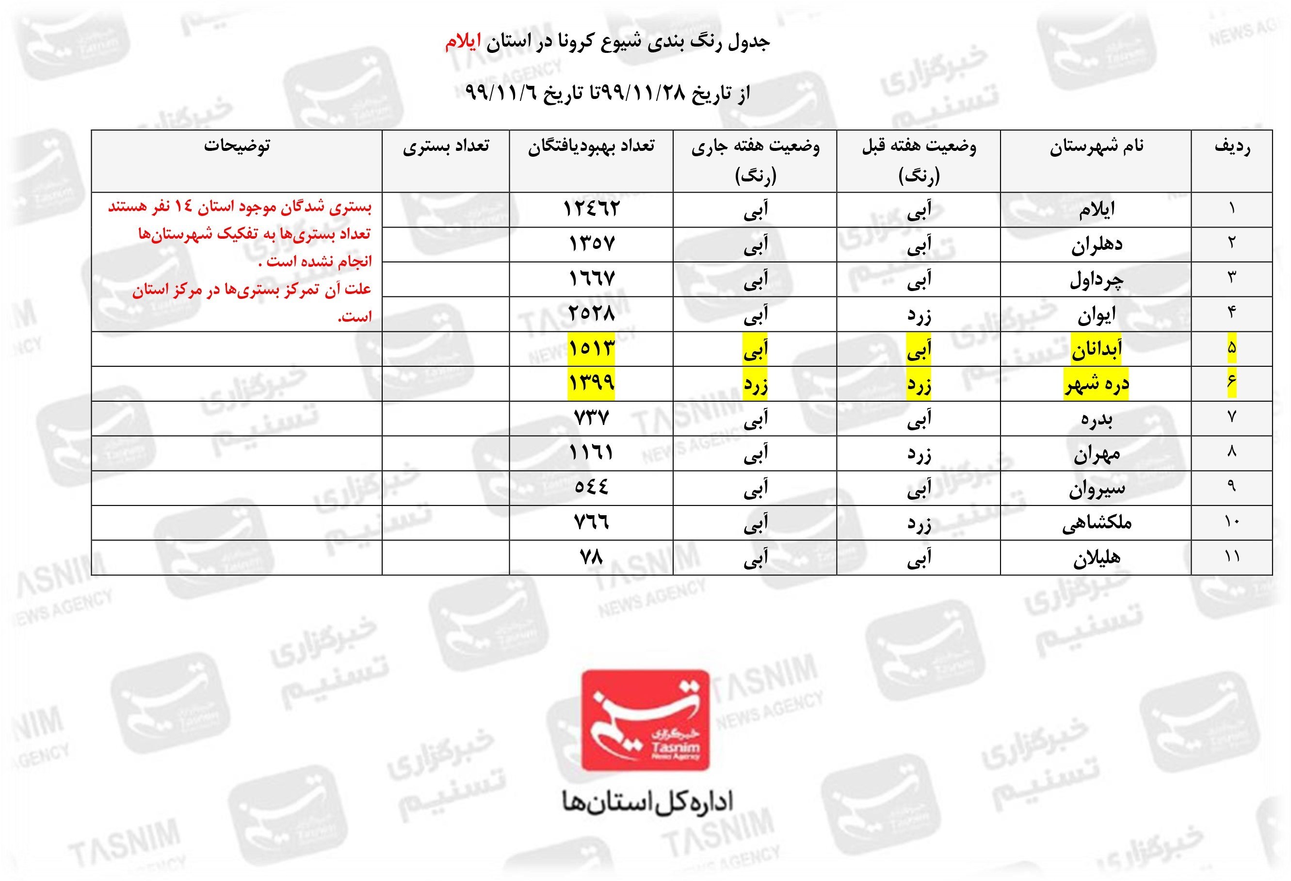 بررسیآمارها نشان میدهد در مقایسه با هفته پیش دو شهرستان جدید ایلام از وضعیت زرد به وضعیت آبی تغییر وضعیت داده است و با احتساب این دو شهرستان از میان شهرستانهای 11 گانه استان ایلام فقط دو شهرستان درهشهر و آبدانان در وضعیت زرد قرار دارند.