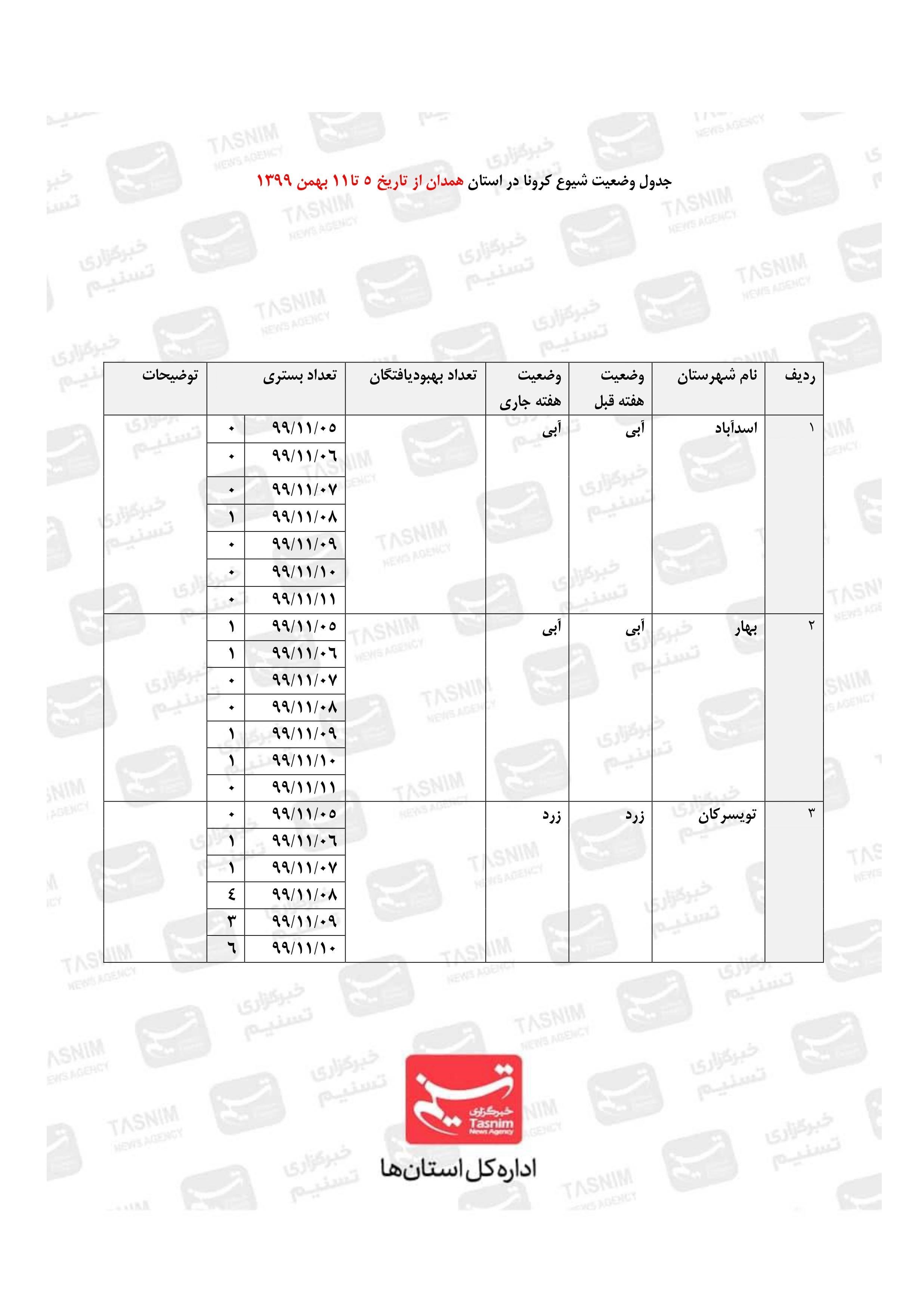به گزارش خبرگزاری تسنیم از همدان، بر اساس آمار دریافتی از دانشگاه علوم پزشکی همدان از تاریخ 5 تا 11 بهمن ماه، وضعیت 5 شهرستان استان آبی است و مابقی در حالت زرد به سرمیبرند.