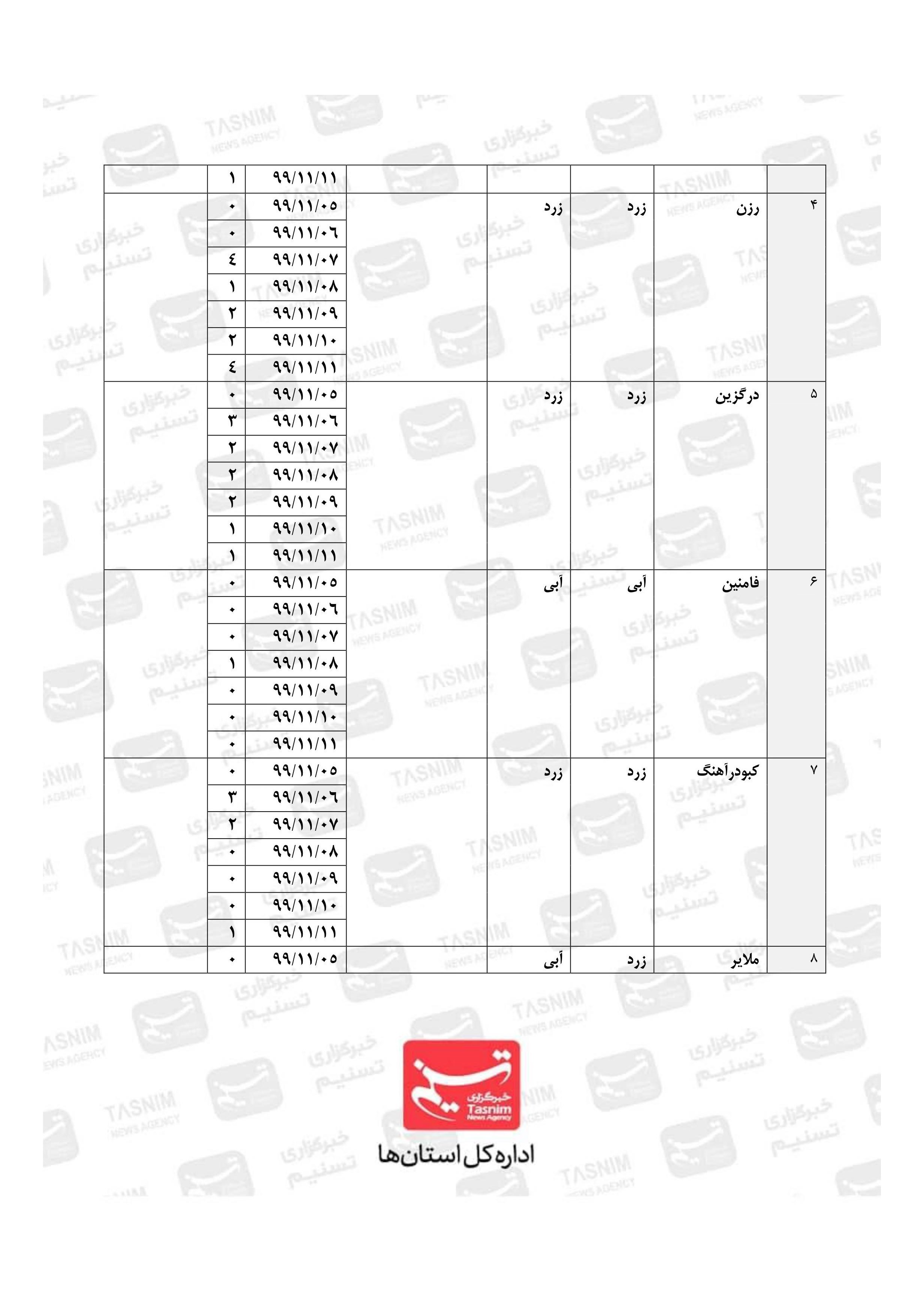 رئیس دانشگاه علوم پزشکی همدان گفت: در حال حاضر وضعیت شهرستانهای همدان، ملایر، فامنین، اسدآباد و بهار به رنگ آبی و مابقی شهرستانها در وضعیت زرد هستند.