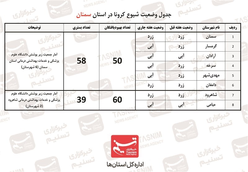 در این هفته همچنین 110 بیمار مبتلا به کرونا در استان سمنان، پس از بهبودی کامل از بیمارستانها مرخص شدند که از این تعداد سهم دانشگاه علوم پزشکی استان سمنان 50 نفر و سهم دانشگاه علوم پزشکی شاهرود نیز 60 نفر بوده است. در همین حال روند مرگ و میر ناشی از ابتلای قطعی به کرونا در استان سمنان نیز، این هفته روندی کاهشی داشته است.