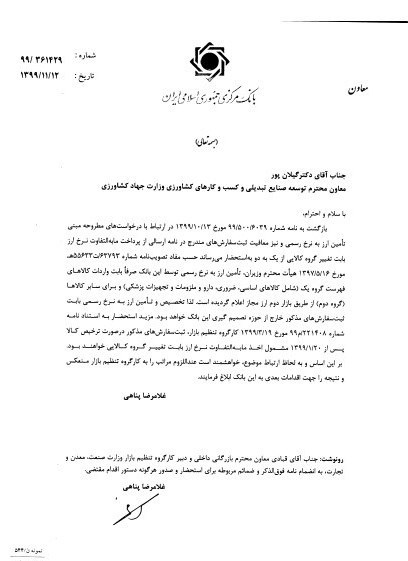بر این اساس نامهنگاریهایی توسط وزارت جهاد کشاورزی و ستاد تنظیم بازار با بانک مرکزی صورت گرفت و درخواست شد که این محصولات پایهای تولید از دریافت مابهالتفاوت معاف شود و تأکید شد که واردات این محصولات با ارز نیمایی منجر به افزایش چندبرابری قیمت برای مصرفکننده نهایی میشود و خرید آن برای بخش کشاورزی توجیه ندارد.