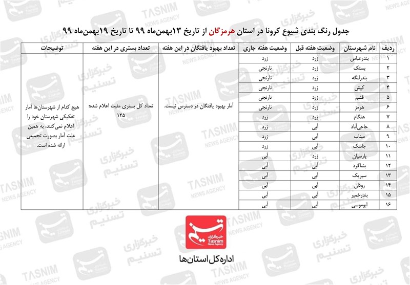 با توجه به اینکه برخی شهرستانهای استان مجدد به رنگ نارنجی(پرخطر) درآمده و تعدادی دیگر نیز در وضعیت زرد به سر میبرند، لازم میباشد جهت جلوگیری از ورود مسافران در این ایام به استان هرمزگان، محدودیتهای بیشتر و کارآمدتری اعمال شود.
