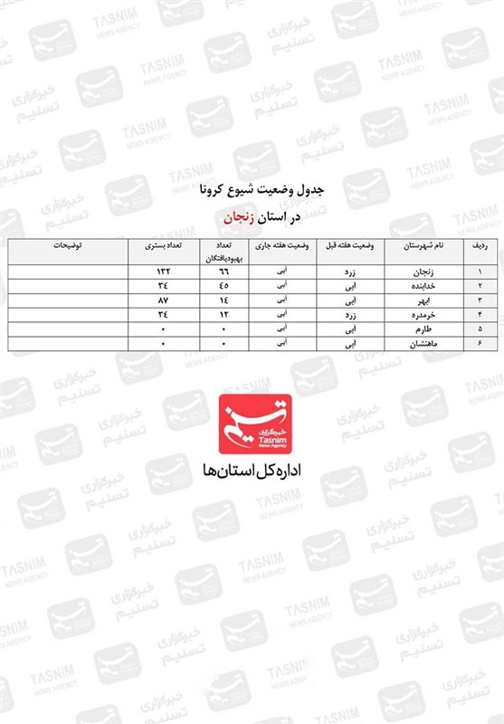 در این راستا مقایسه آمارهای منتشر شده از روند شیوع بیماری در استان زنجان نسبت به هفتههای گذشته نشان میدهد همچنان آمار نزولی است، البته هفته گذشته کمی تعداد افزایش یافت ولی خوشبختانه مجددا آمار نزولی شد. در جدول زیر وضعیت شیوع ویروس کرونا در استان زنجان از تاریخ 12 تا 19 بهمن ماه را نشان میدهد اگرچه وضعیت به سمت بهبودی نسبی حرکت کرده ولی هرلحظه ممکن است مجدداً وضعیت این استان به حالت قرمز برگردد.