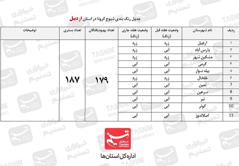 چهار شهرستان اردبیل دارای وضعیت زرد و مابقی در وضعیت آبی قرار دارند و در طول هفته گذشته روز بدون فوتی در استان ثبت نشده است.
