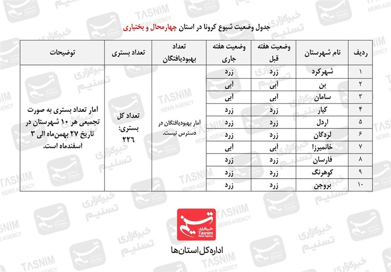 به گزارش خبرگزاری تسنیم از  شهرکرد ، بررسی آمار و وضعیت ویروس نوپدید کووید19 در هفته اخیر (27 بهمن‌ماه الی 3 اسفندماه) در استان چهارمحال و بختیاری، نشان از عدم تغییر زیاد آمار بستری‌ها نسبت به دو هفته پیش را دارد، در هفته گذشته تعداد کل بستری‌ها در مراکز درمانی 10 شهرستان استان، 226 نفر بوده است که نسبت به دو هفته پیش که 224 نفر بود، تغییر زیادی نکرده است.