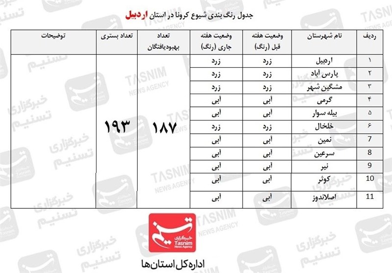 در طول 24 ساعت گذشته آخرین وضعیت کرونا در استان اردبیل با 25 بستری، 0 فوتی، 34 بهبود یافته و 48 مورد بستری آی‌سی‌یو و 164 بستری موجود به ثبت رسیده و وضعیت چهار شهرستان پارس‌آباد، مشگین‌شهر، اردبیل و خلخال زرد و نمین، نیر، کوثر، سرعین، بیله‌سوار، گرمی و اصلاندوز آبی است.