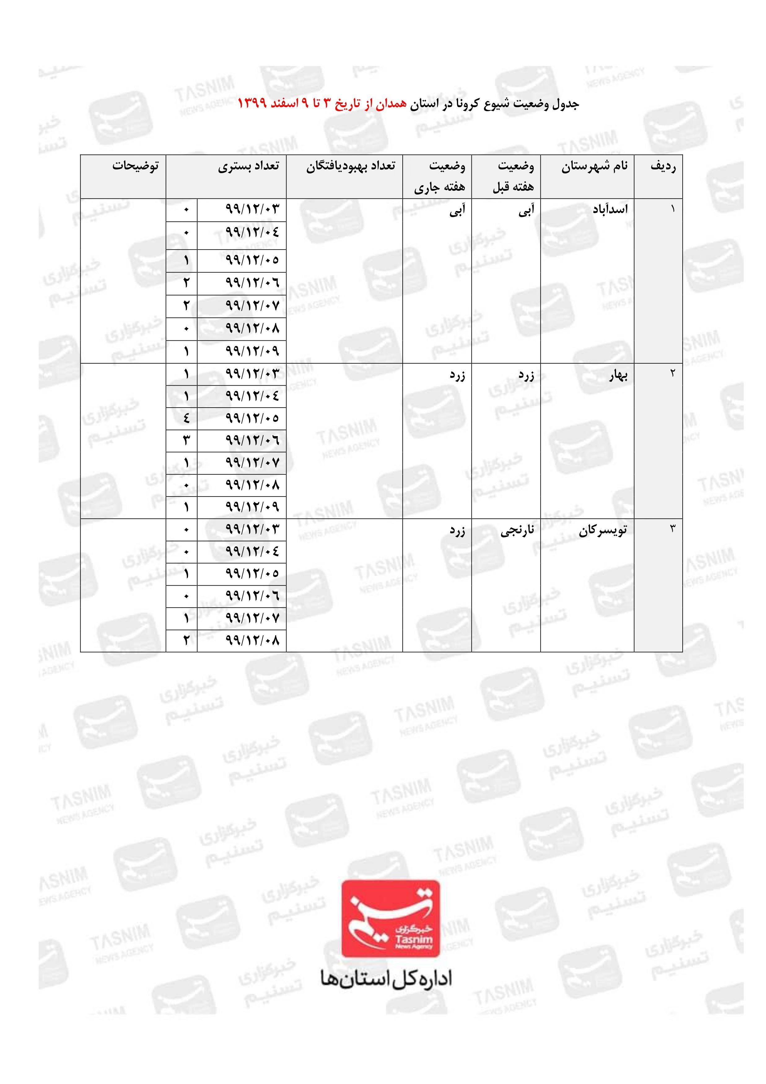 به گزارش خبرگزاری تسنیم از همدان، بر اساس آمار منتشر شده از دانشگاه علوم پزشکی همدان، از تاریخ 3 تا 9 اسفند ماه شهرستان اسدآباد در وضیعت آبی و مابقی شهرستانهای استان در وضعیت زرد قرار گرفته است. با تلاش کادر بهداشت و درمان و انجام تستهای سریع و رایگان کرونا وضعیت شهرستان تویسرکان از نارنجی به حالت زرد تغییر یافته است.