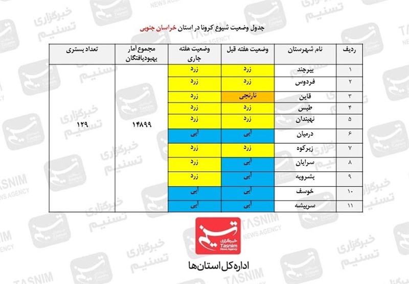 شهرستان قاین که هفته گذشته در وضعیت نارنجی بود این هفته در وضعیت زرد قرار گرفته است و شهرستانهای سرایان و بشرویه نیز از وضعیت آبی به وضعیت زرد تغیر رنگ دادهاند.