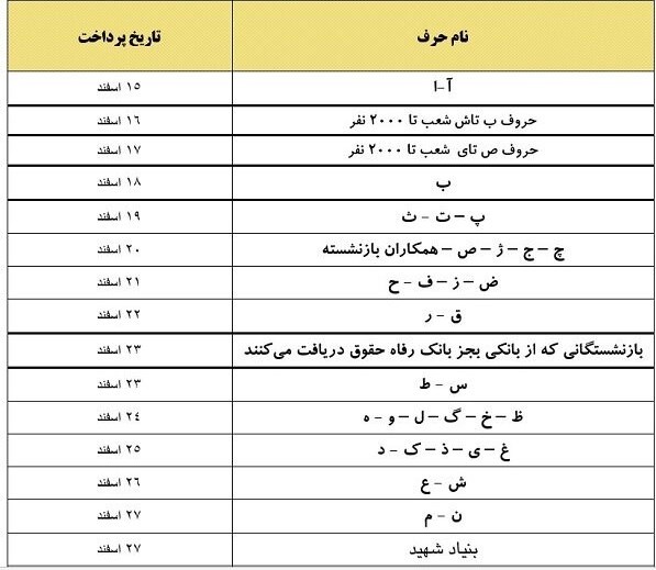 پرداخت حقوق بازنشستگان و مستمری بگیران سازمان تأمین اجتماعی از 15 اسفند آغاز شده و تا 27 اسفند و براساس حروف الفبا به حساب آنان واریز می‌شود.