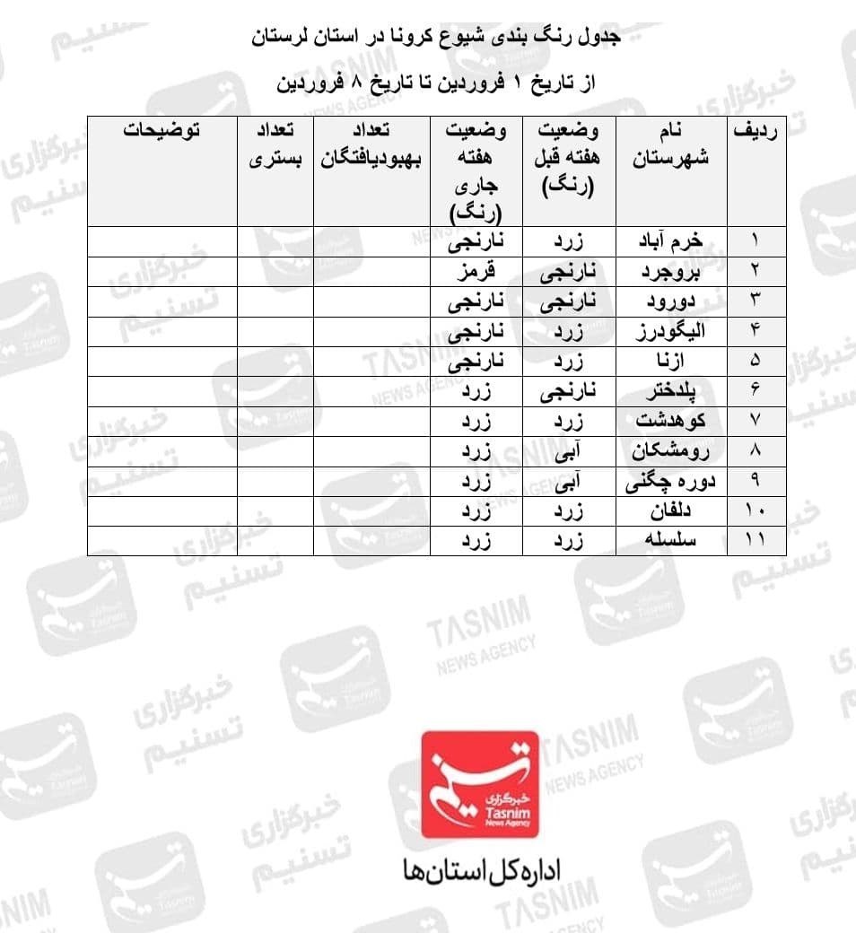 با توجه به افزایش تعداد مبتلایان وضعیت رنگ بندی کرونایی شهرستانهای لرستان نیز تغییر کردبه طوری که شهرستان بروجرد که طی هفتههای گذشته به نارنجی تغییر کرده بود اخیر به قرمز تبدیل شد و رنگ شهرستانهای خرمآباد، ازنا و الیگودرز از زرد به نارنجی تغییر کرد.