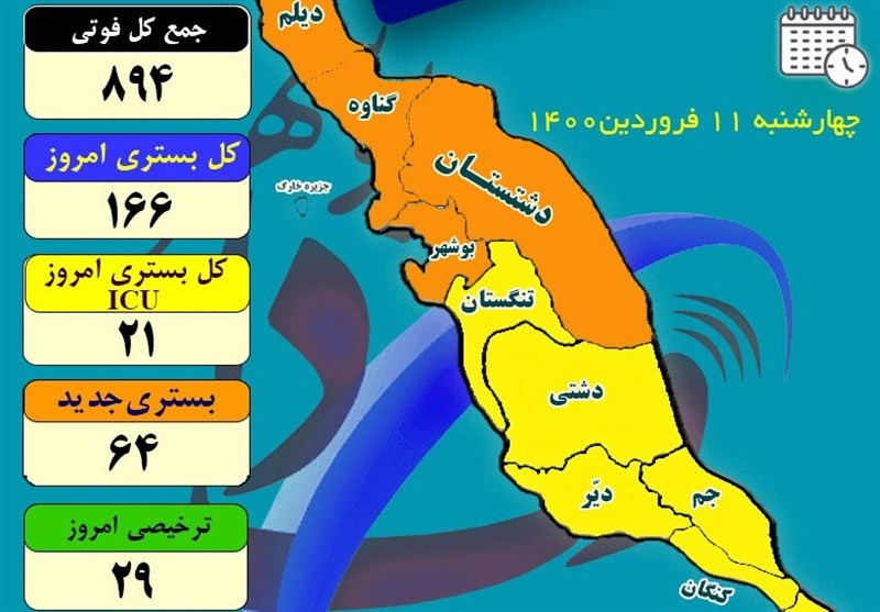 رئیس دانشگاه علوم پزشکی بوشهر، از نارنجی بودن شهرستانهای بوشهر، دشتستان، دیلم و گناوه خبر داد و بیان کرد: بر اساس برنامهریزی تردد هرگونه خودرو با پلاک غیر بومی به این شهرستانها ممنوع است و در صورت بیتوجهی، رانندگان این خودروها جریمه و اعمال قانون میشوند.