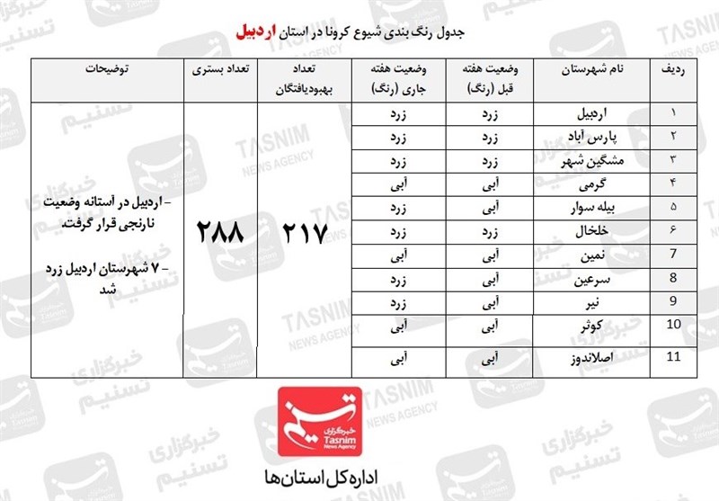 براساس آخرین وضعیت اعلام شده توسط وزارت بهداشت، هم اکنون شهرهای اردبیل، پارسآباد، مشگینشهر، خلخال، سرعین، بیله سوار و نیر در وضعیت زرد و شهرهای نمین، گرمی، کوثر و اصلاندوز در وضعیت آبی قرار دارند.