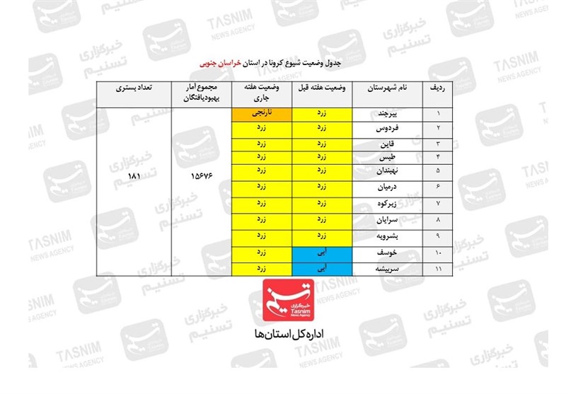 به گزارش خبرگزاری تسنیم از بیرجند، با بررسی اجمالی از روند همهگیری کرونا و با توجه به محدودیتهای اعمال شده طی هفتههای گذشته 10 شهرستان زیرکوه، فردوس، نهبندان، طبس، سرایان، بشرویه، قاین، درمیان، خوسف و سربیشه در وضعیت زرد قرار دارند و شهرستان بیرجند نیز در وضعیت نارنجی قرار گرفته است.