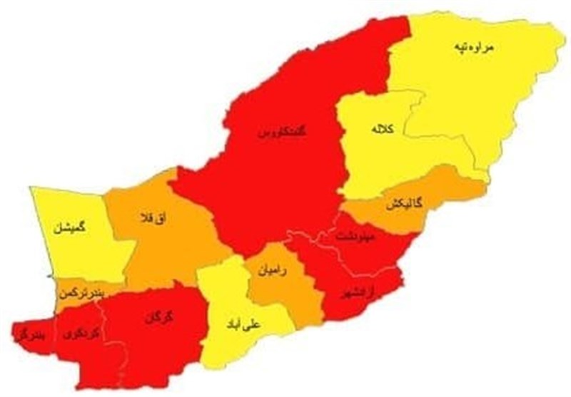 در زمان حاضر از 14 شهرستان وضعیت 6 شهرستان شامل بندرگز، کردکوی، گرگان، آزادشهر، مینودشت و گنبدکاووس قرمز شده است، همچنین بندرترکمن، آققلا، رامیان و گالیکش هم در شرایط هشدار کرونایی هستند و وضعیت سایر شهرستانها شامل گمیشان، علیآبادکتول، کلاله و مراوهتپه نیز زرد است.