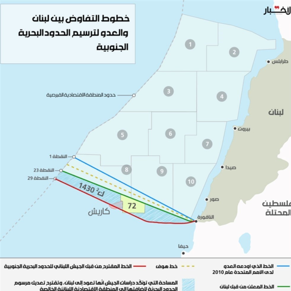 مذاکرات غیرمستقیم لبنان با رژیم صهیونیستی به سرپرستی و میانجیگری آمریکا و زیر چتر سازمان ملل پس از برگزاری چهار جلسه در مقر سازمان ملل در« راس الناقوره » دورترین نقطه واقع در جنوب غرب لبنان هم اکنون متوقف مانده است زیرا هیئت لبنانی علاوه بر 860 کیلومتر مورد اختلاف میان دو طرف اعلام کرده که به حق خود در 1430 کیلومتر اضافه نیز پایبند است؛ موضوعی که خشم آمریکا و رژیم صهیونیستی را برانگیخت.