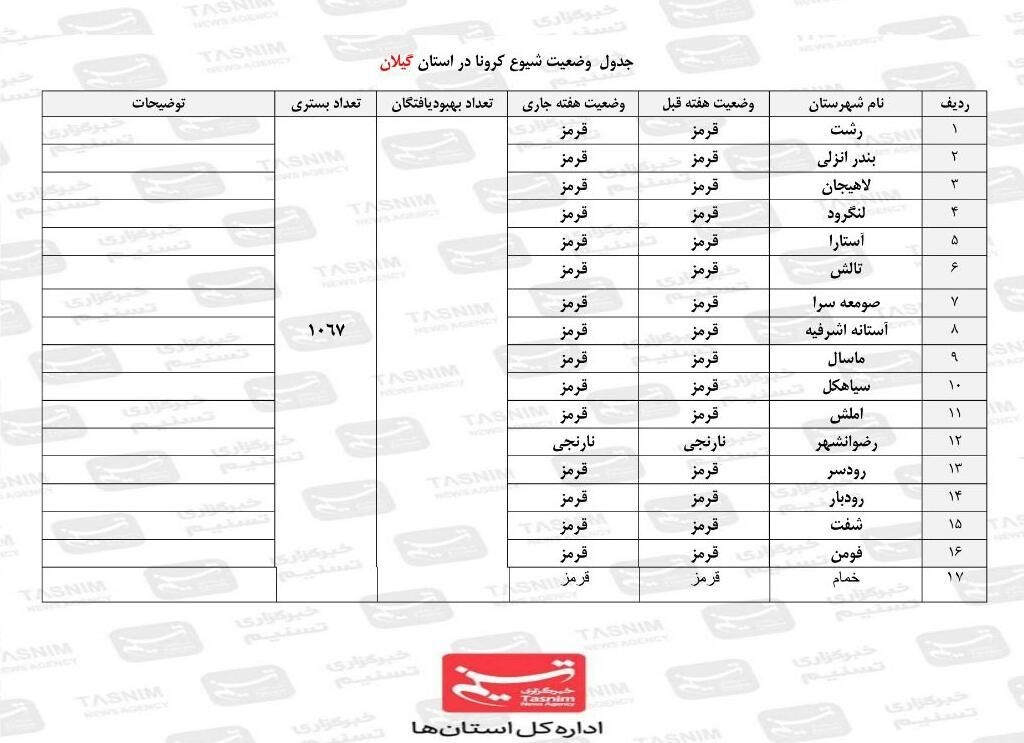 به گزارش خبرگزاری تسنیم از رشت، در حال حاضر تمام شهرستانهای استان گیلان به جز شهرستان رضوانشهر در وضعیت قرمز قرار دارد که البته شهرستان رضوانشهر نیز در وضعیت پرخطر کرونایی به سر سر میبرد.