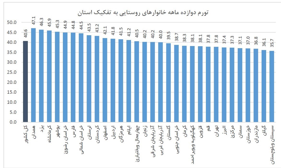 در نرخ تورم دوازده ماهه خانوارهای روستایی نیز نرخ تورم استان فارس بالاتر از میانگین کشوری و این افزایش نسبت به نرخ تورم خانوارهای شهری نیز بیشتر است. براساس گزارش مرکز آمار ایران نرخ تورم دوازده ماهه خانوارهای روستایی در کشور 40.6 درصد است که این میزان در استان فارس 44.8 است.
