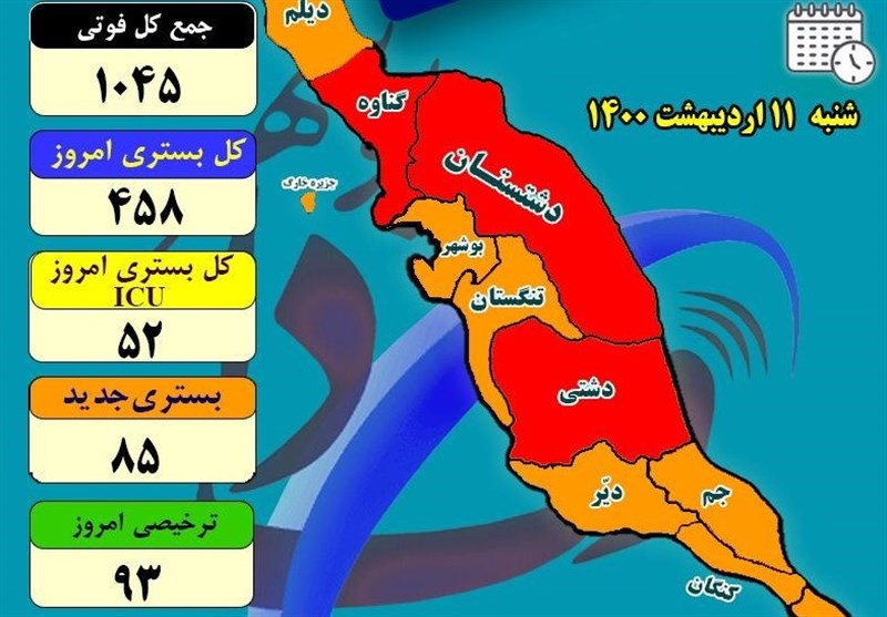 به گزارش خبرگزاری تسنیم از بوشهر، وضعیت 10 شهرستان استان بوشهر در رنگ‌بندی کرونایی شامل 7 شهرستان نارنجی و 3 شهرستان قرمز است که تنها راه مصون ماندن از ابتلا به بیماری کرونا رعایت دستورالعمل بهداشتی به ویژه استفاده مکرر از ماسک و پرهیز از دورهمی خانوادگی و تجمعات است.