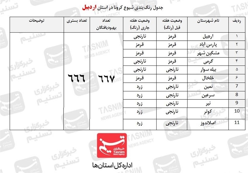 براساس آخرین وضعیت اعلام شده توسط وزارت بهداشت، هم اکنون شهرستان های پارس آباد، مشگینشهر و خلخال در وضعیت قرمز و شهرستانهای اردبیل، گرمی و بیله سوار در وضعیت نارنجی و شهرستانهای نیر، نمین، سرعین، کوثر و اصلاندوز در وضعیت زرد قرار دارند.