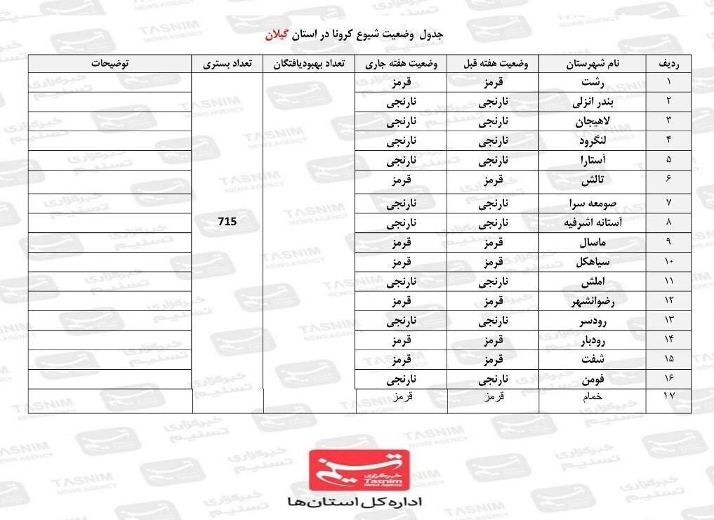 در حال حاضر 9 شهرستان استان گیلان شامل آستارا، بندر انزلی، صومعهسرا، فومن، آستانه اشرفیه، لاهیجان، لنگرود، املش و رودسر در وضعیت نارنجی و رشت، رضوانشهر، رودبار، سیاهکل، شفت، تالش، ماسال و خمام در وضعیت قرمز کرونایی به سر میبرند.