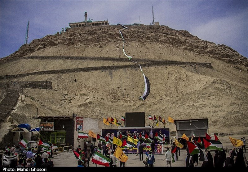 دانشجویان قمی ضمن به آتش کشیدن پرچم اسرائیل و آمریکا و سردادن شعارهای اسکتبار ستیزی، پرچم 300 متری فلسطین را از بالای کوه به نمایش گذاشتند.