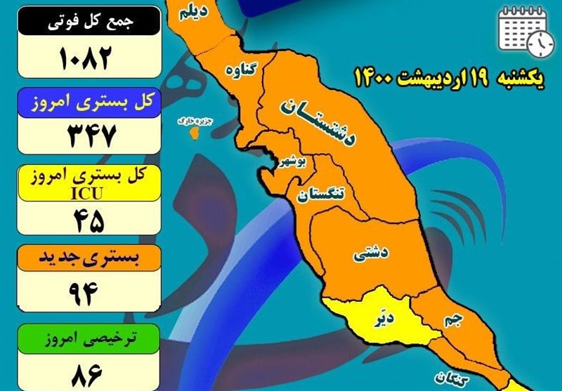 استان بوشهر که تا هفته آخر اسفند دارای وضعیت نسبتاً مطلوبی نسبت به دیگر استانها داشت در فروردین ماه امسال با آغاز پیک چهارم، مبتلایان به ویروس جهش یافته سیر صعودی گرفت و زمینه افزایش بستریها و فوتیها را فراهم کرد.