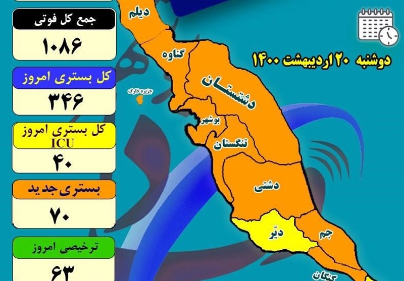 رئیس دانشگاه علوم پزشکی بوشهر بیان کرد: از 10 شهرستان استان بوشهر 80 درصد نارنجی و 20 درصد زرد هستند.