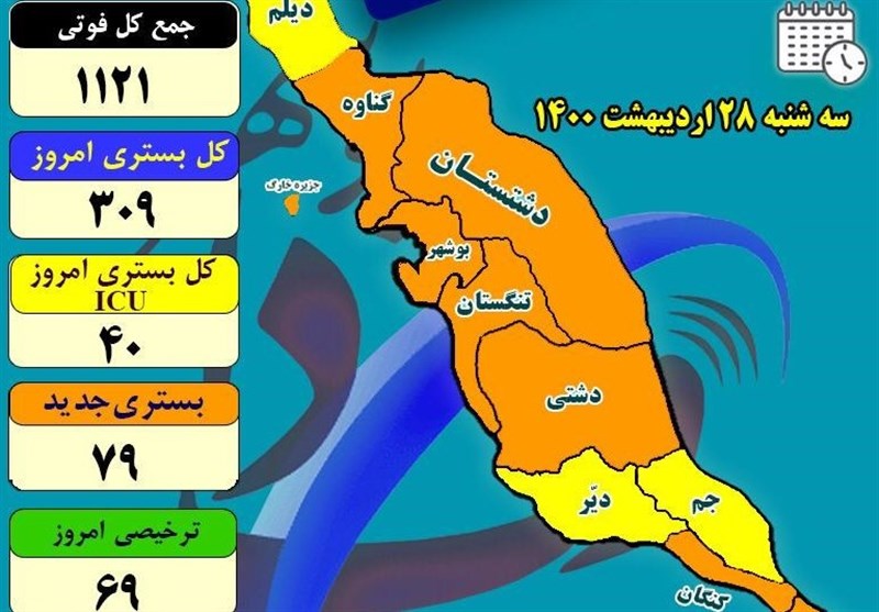 دبیر ستاد مقابله با کرونا استان بوشهر، تعداد فوتیهای کرونایی را یکهزار و 121 نفر دانست و خاطر نشان کرد: از آغاز شیوع کرونا تاکنون بیش از 40 هزار و 400 نفر در استان بوشهر به این ویروس مبتلا شدهاند.