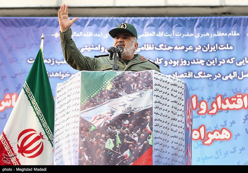 سردار سلامی در پایان گفت: جان من و فرزندانم و هرآنچه دوست دارم فدای مردم ایران است. عزیزترین و مقتدرترین مردمی که مقابل قدرت‌های بزرگ زانو نزدند و دشمن را به تسلیم وادار کردند شما هستید و میدان از آن شما است، پیش بروید که صحنه از آن شما است و دشمنانتان در حال عقب نشستن هستند.