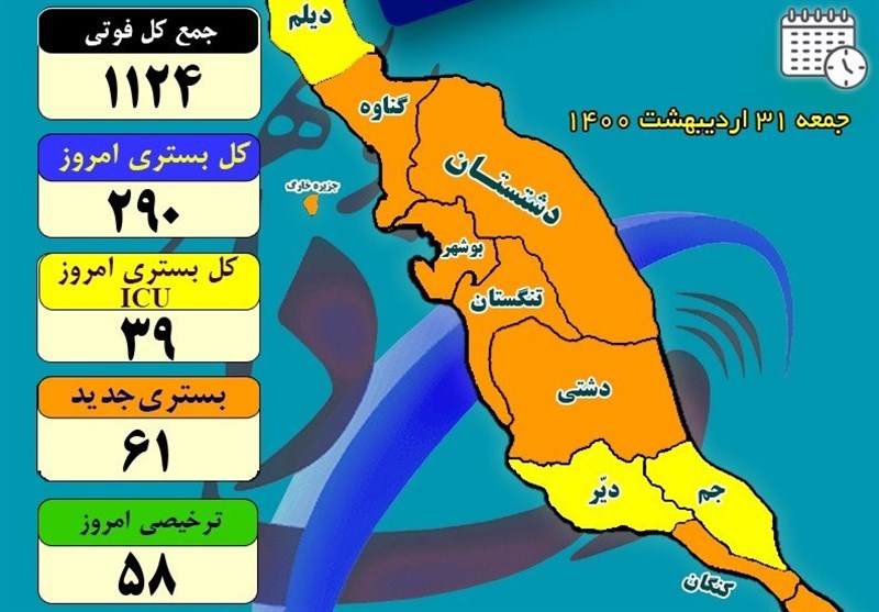 رئیس دانشگاه علوم پزشکی بوشهر، روز بدون فوتی کرونا در استان را مورد اشاره قرار داد و تصریح کرد: پس از یک دوره سخت و طوفانی، امروز آمار فوت ناشی از کرونا در استان بوشهر صفر ثبت شد و اکنون شمار فوتیهای ناشی از این بیماری در استان بوشهر یک هزار و 124 نفر است.