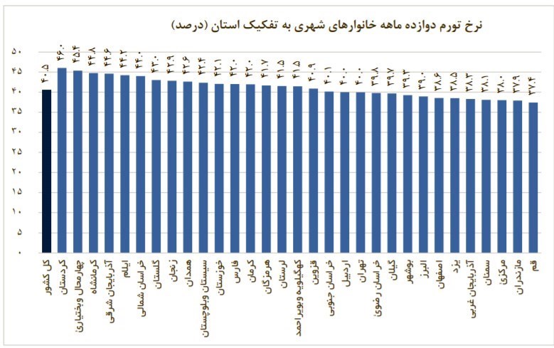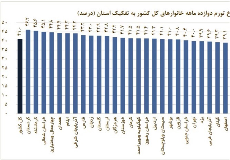 در همین راستا؛ مرکز آمار اخیراً آخرین وضعیت نرخ تورم در استانهای مختلف را منتشر کرد. طبق گزارش منتشره نرخ تورم 12ماهه منتهی به اردیبهشت ماه 1400 برای خانوارهای کشور 41 درصد شده است که براساس مستندات بیشترین نرخ تورم کشور با 46.2 درصد متعلق به استان کردستان و کمترین آن با 37.5 درصد مربوط به استان قم است.