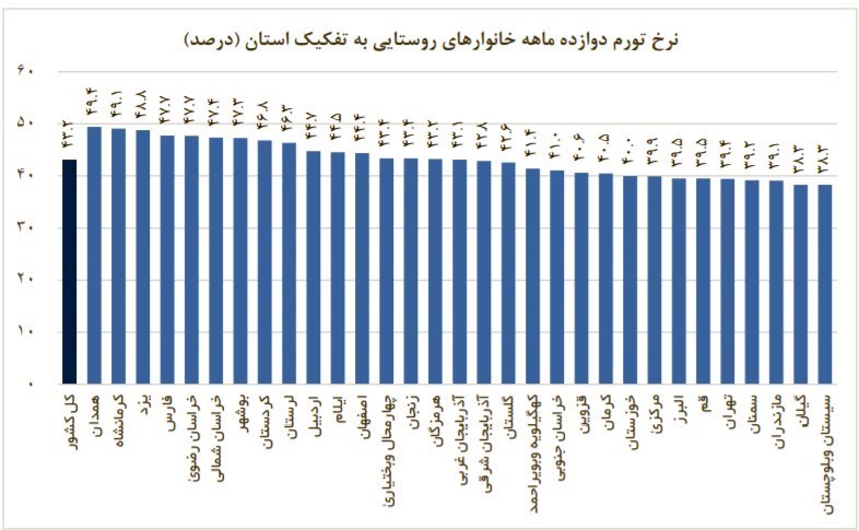 در این ماه بیشترین نرخ تورم نقطه به نقطه مربوط به استان ایلام با 59 درصد و کمترین آن مربوط به استان قم با 43 درصد است، همچنین نرخ تورم 12ماهه منتهی به اردیبهشت ماه سال جاری برای خانوارهای روستایی به عدد 43.2 درصد رسیده است که بیشترین نرخ تورم 12ماهه مربوط به استان همدان با 49.4 درصد و کمترین آن مربوط به استانهای سیستان و بلوچستان و گیلان با 38.3 درصد است.