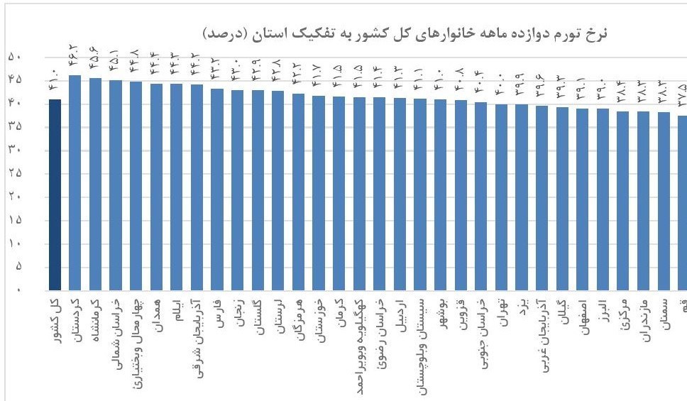 بر این اساس نرخ تورم دوازده ماهه منتهی به اردیبهشت ماه برای خانوارهای کشور 41 درصد بوده است. در بررسی نرخ تورم گروه اصلی کالاها و خدمات در نظر گرفته میشود که شامل خوراکیها و آشامیدنیها، دخانیات، پوشاک و کفش، مسکن-آب-برق و سایر سوختها، مبلمان و لوازم خانگی، بهداشت و درمان، حمل و نقل، ارتباطات، تفریح و فرهنگ، آموزش، هتل و رستوران، کالاها و خدمات متفرقه است.