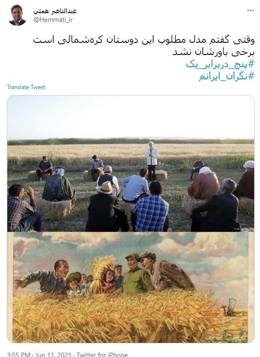 عبدالناصر همتی کاندیدای اصلاح‌طلب سیزدهمین دوره انتخابات ریاست‌جمهوری در جدیدترین توئیت خود، تصویر اشتباهی از مائو را به‌عنوان رهبر سابق کره شمالی (احتمالاً کیم ایل سونگ) منتشر کرده و با مقایسه این عکس با تصویر سعید جلیلی دیگر کاندیدای انتخابات در یک زمین کشاورزی، نوشته «وقتی گفتم مدل مطلوب این دوستان کره‌شمالی است برخی باورشان نشد.»