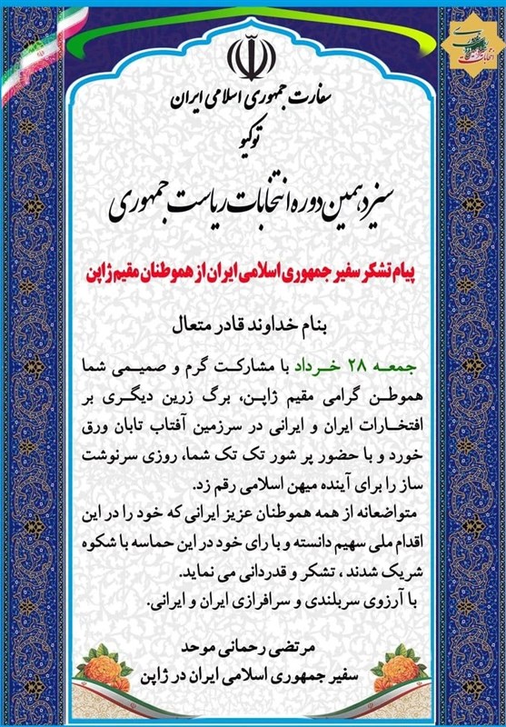 همچنین با پایان گرفتن زمان اخذ رای و انجام شمارش آرا سفیر کشورمان در ژاپن طی پیامی از حضور هموطنان مقیم ژاپن تقدیر و تشکر نمود.