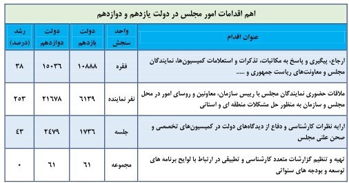وی ادامه داد: همچنین ملاقات نمایندگان با رئیس سازمان برنامه نیز در دولت یازدهم 6 هزار مورد بوده است که این آمار در دولت دوازدهم در حدود 200 درصد رشد داشته است. همچنین ارائه نظرات کارشناسی و دفاع از دیدگاه های دولت در کمیسیونها در دولت دوازدهم در حدود 40 درصد به نسبت دولت یازدهم رشد داشته است.