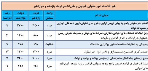 وی افزود: اقدام دیگر رسیدگی به شکایات مناقصات و قانون برگزاری مناقصات است که نسبت به دولت یازدهم 9 درصد رشد داشته است. تصمیم گیری در حوزه اموال غیر منقول نیز در این حوزه قرار میگیرد و تمام دستگاههایی که میخواهند در خصوص دارایی ها تغییر ایجاد کنند باید در کمیته مربوط تعیین تکلیف شود که این مورد نیز در دولت دوازدهم به نسبت یازدهم 12 درصد رشد داشته است.