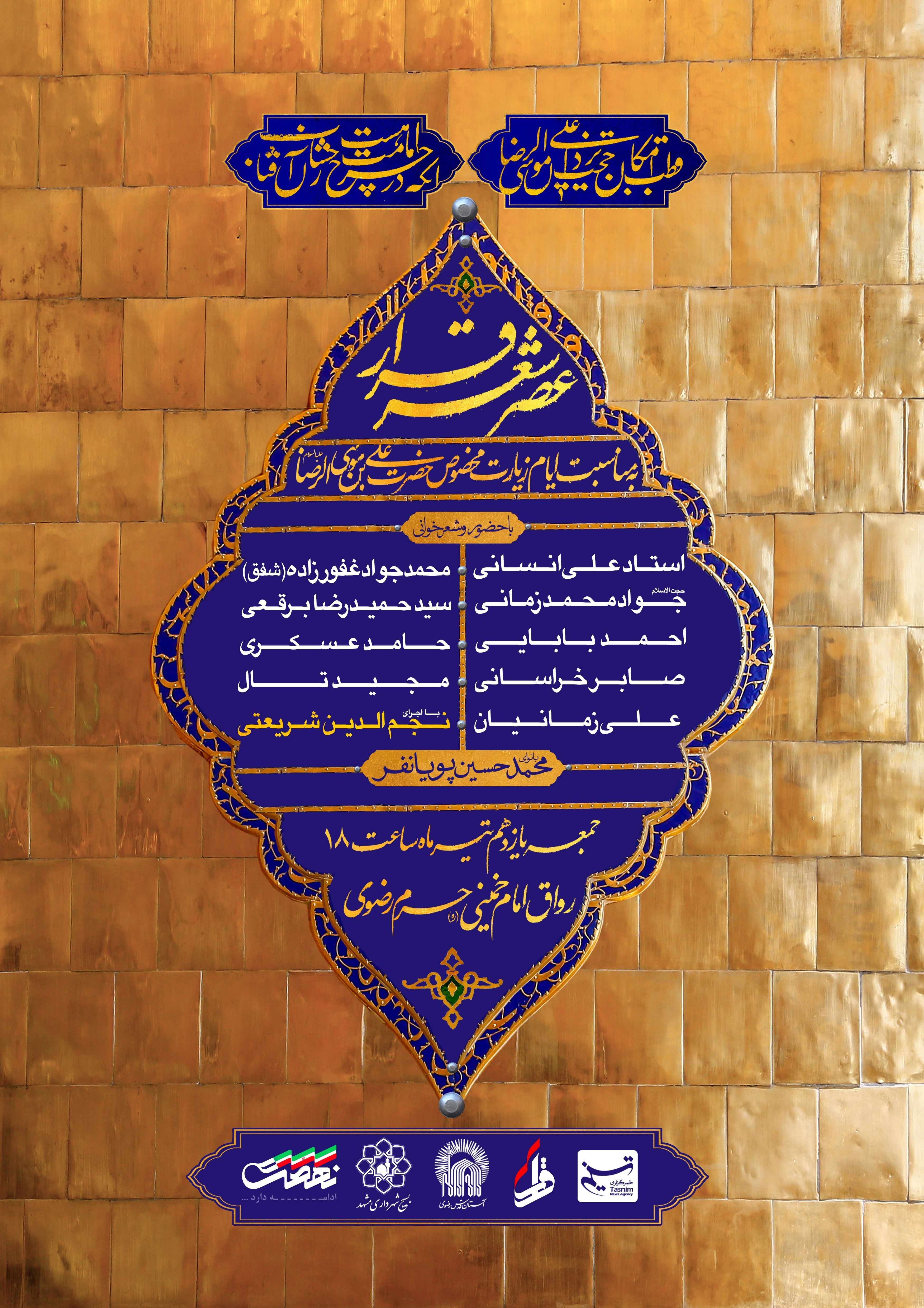 جدیدترین عصر شعر قرار با مشارکت سازمان تبلیغات اسلامی و آستان قدس رضوی بهمناسبت ایام زیارت مخصوص علیبن موسی الرضا علیهما السّلام در مشهد مقدس و در حرم مطهر رضوی برگزار میشود.