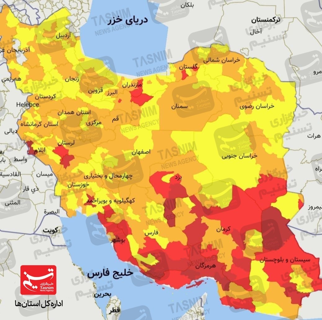 بر اساس نقشه رنگبندی جدید شهرستانهای جم، دیلم و گناوه در استان بوشهر، اسلامشهر و بهارستان در استان تهران، نهبندان در استان خراسان جنوبی، امیدیه و اندیمشک در استان خوزستان، بمپور، زهک، سراوان، سرباز و میرجاوه در استان سیستان و بلوچستان، جهرام، داراب، زریندشت، قیروکارزین و کازرون در استان فارس، ارزوئیه، رفسنجان، سیرجان و عنبرآباد در استان کرمان، گچساران در استان کهگیلویه و بویراحمد، علیآباد و مینودشت در استان گلستان، پلدختر در استان لرستان، آمل در استان مازندران، تفت، خاتم، مهریز و میبد در استان یزد در وضعیت قرمز قرار گرفتند.