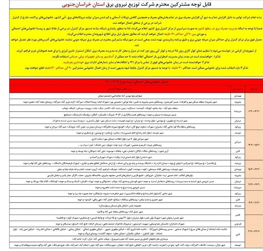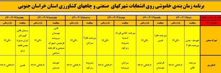 به گزارش خبرگزاری تسنیم از بیرجند، جدول زمانبندی خاموشیهای احتمالی برق استان خراسان جنوبی برای مشترکان خانگی در روز شنبه 12 تیر و صنایع تا پایان هفته منتشر شد.
