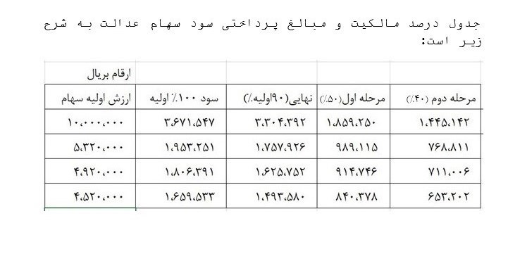 همچنین بدین وسیله اعلام میدارد، شرکتهای مخابرات ایران و گروه مپنا علی رغم پیگیریهای متعدد متاسفانه تمام یا بخشی از سود سهام خود را پرداخت نکرده اند و با محاسبه این دو گروه که توضیحات آنها ارائه شد، از باقی مانده سود سهام عدالت به میزان 50 درصد؛ 40 درصد آن به حساب مشمولان واریز شده است.