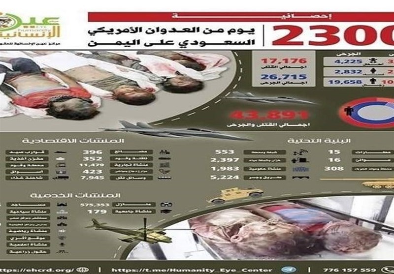 این مرکز اعلام کرد که در طول 2300 روز گذشته از تجاوز عربستان، 17176 نفر در یمن به شهادت رسیدهاند که 10934 نفر از آنها مرد، 2400 نفر زن و 3842 نفر نیز کودک هستند. همچنین در طول این مدت 26715 شهروند یمنی مجروح شدهاند که 2832 نفر از آنها زن، 19658 نفر مرد و 4225 نفر کودک هستند.