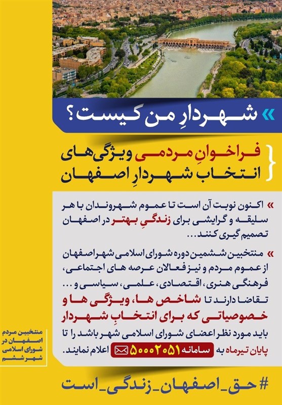 وی اضافه کرد: براساس این فراخوان، مردم و فعالان عرصههای اجتماعی، فرهنگی، هنری، اقتصادی، علمی و سیاسی میتوانند شاخصها، ویژگیها و خصوصیاتی که برای انتخاب شهردار مد نظر قرار دارند را تا پایان تیرماه از طریق پیامک به سامانه 50002051 ارسال کنند.