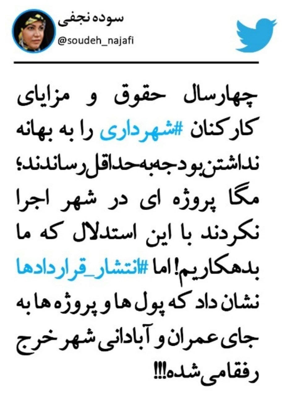 به گزارش گروه اجتماعی خبرگزاری تسنیم، سوده نجفی عضو منتخب ششمین دوره شورای شهر تهران در صفحه شخصی خود نوشت: 4 سال حقوق و مزایای کارکنان شهرداری را به بهانه نداشتن بودجه به حداقل رساندند؛ مگاهپروژهای در شهر اجرا نکردند با این استدلال که ما بدهکاریم؛ اما انتشار قراردادها نشان داد که پولها و پروژهها به جای عمران و آبادانی شهر خرج رفقا میشده!!!