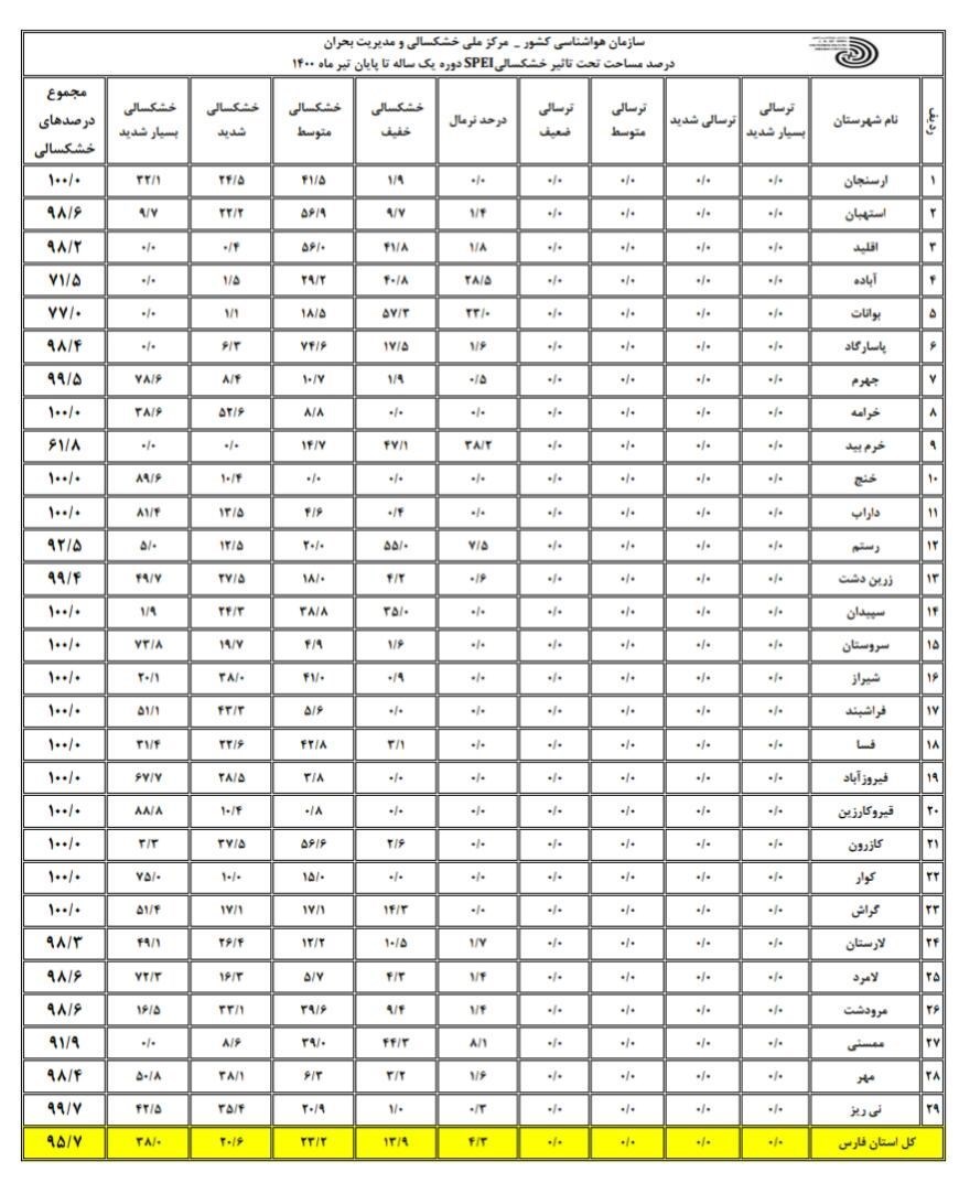 به گزارش خبرگزاری تسنیم از شیراز، مرکز ملی اقلیم و مدیریت بحران خشکسالی درصد مساحت تحت تاثیر خشکسالی کشور را در یک دوره یکساله تا تیرماه 1400 را منتشر کرد. در این جدول درصد مساحت تحت تاثیر خشکسالی فارس 95.7 درصد اعلام شده است.