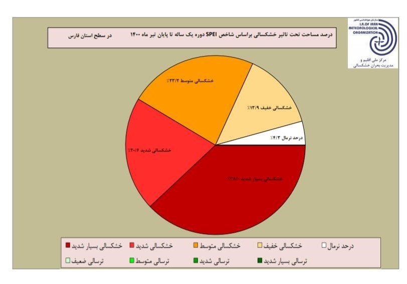 براساس جدول منتشر شده 38 درصد مساحت فارس تحت تاثیر خشکسالی بسیار شدید، 20.6 درصد خشکسالی شدید، 23.2 درصد خشکسالی متوسط، 13.9 درصد خشکسالی خفیف است و در 4.3 درصد مساحت فارس بارندگی در حد نرمال است. در این بازه زمانی درصد مساحت تحت تاثیر ترسالی در فارس صفر بوده است.