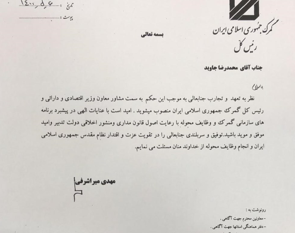 به گزارش خبرنگار اقتصادی خبرگزاری تسنیم، رئیس کل گمرک ایران در روزهای پایانی دولت دوازدهم اقدام به انتصاب یک مشاور در این سازمان نموده است. بر این اساس فردی به نام جاوید به عنوان مشاور معاون وزیر اقتصاد منصوب شده است.