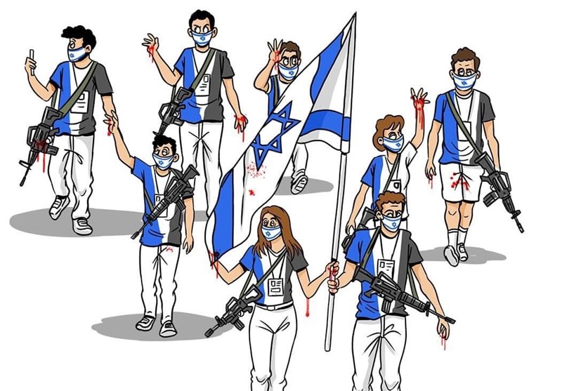 این کاریکاتوریست، کاروان ورزشی رژیم صهیونیستی در المپیک توکیو را به گونه‌ای ترسیم کرد که ورزشکارانش اسلحه در دست دارند و پرچم‌شان هم آغشته به خون فلسطینی‌ها است.
